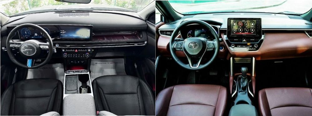 Trong khi đó, Toyota Corolla Cross tập trung vào sự tiện dụng. Thiết kế nội thất tối giản, dễ thao tác, ít nút bấm, màn hình trung tâm đặt nổi. Chất lượng ghế da tốt, hàng ghế sau rộng hơn so với kích thước tổng thể. Tuy nhiên, các chi tiết nhựa cứng vẫn xuất hiện nhiều, giảm phần sang trọng.